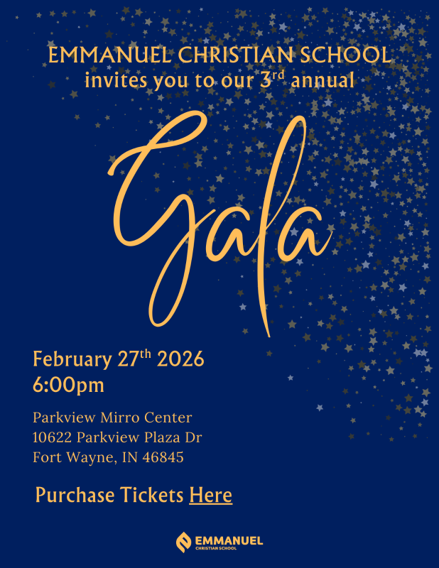 We are excited to invite you to Emmanuel Christian School's annual Gala on February 27th, 2026 at the Parkview Mirro Center for Research and Innovation. This is an evening dedicated to celebrating our mission and raising vital funds to support Christian education. This year’s Gala promises to be an unforgettable night of fellowship, inspiration, and generosity as we come together to make a lasting impact on students and families in our community.