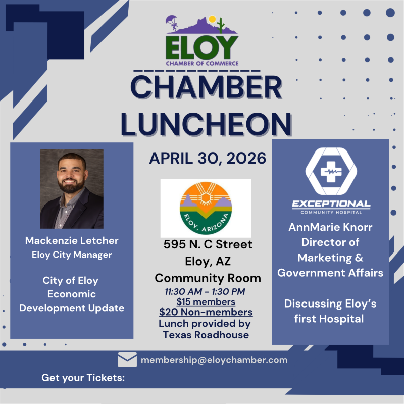 Join us on April 30, 2026 for the Eloy Chamber of Commerce Luncheon.