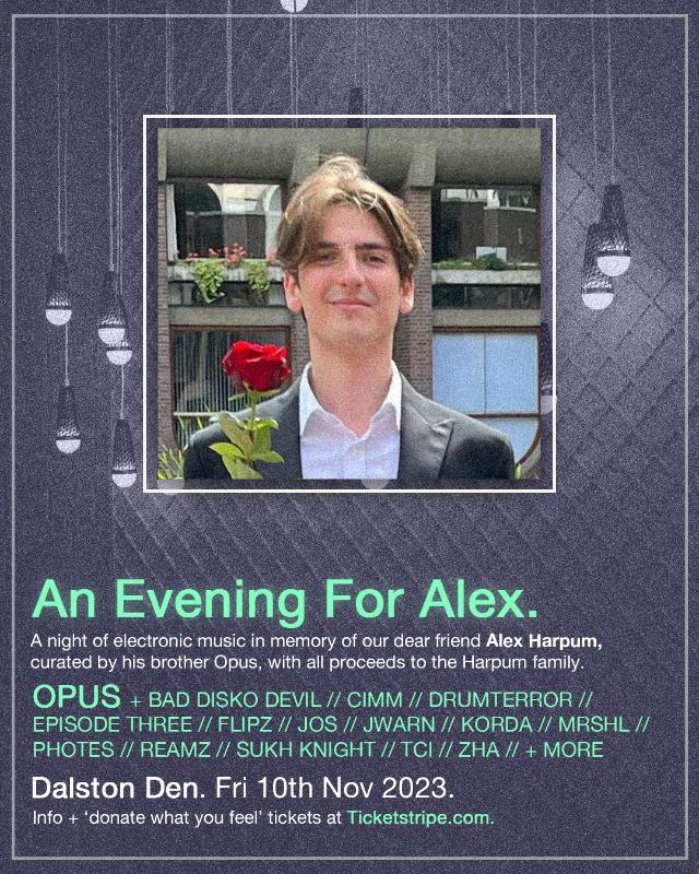 In memory of our dear friend Alex Harpum, we'll be throwing a late-night fundraiser, with DJ sets from his family, closest friends and some of his favourite DJs.