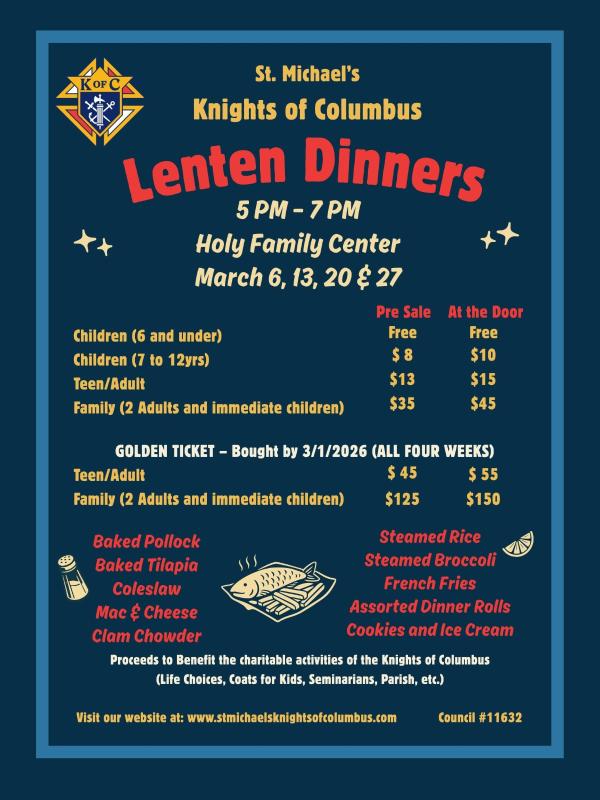 Come join the St. Michael's Knights of Columbus for great food, music and comradery at our Lenten Dinners on Fridays from March 6 through March 27 from 5PM to 7PM. All major credit cards accepted as well as cash and checks. Buy your tickets before Fridays to get great discounts on tickets, or get a Golden Ticket (individual or family) now for all 4 Friday Dinners!