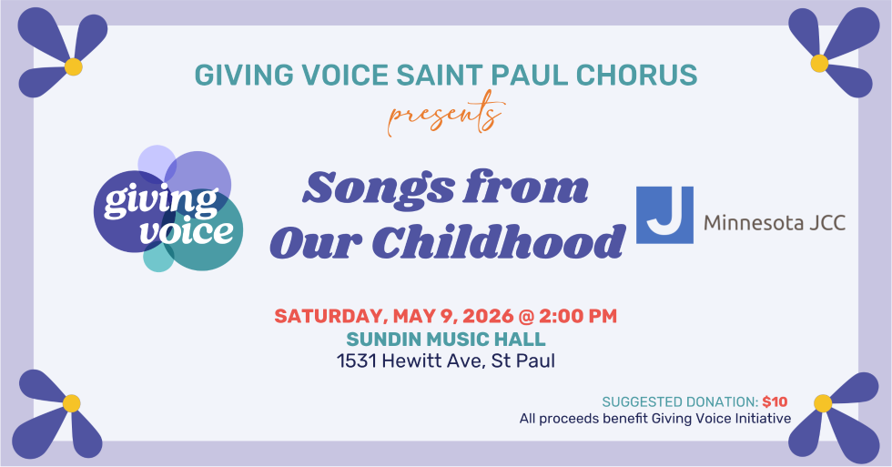 Each semester of our Giving Voice Twin Cities Chorus program culminates in a joyful, uplifting, family-friendly community concert of great music and moving singer stories. For Spring 2026, each Giving Voice Twin Cities Chorus is working on Songs from Our Childhood. We hope you will join us to celebrate the dedication we give to this music and to each other at our 13 weekly rehearsals throughout the semester.