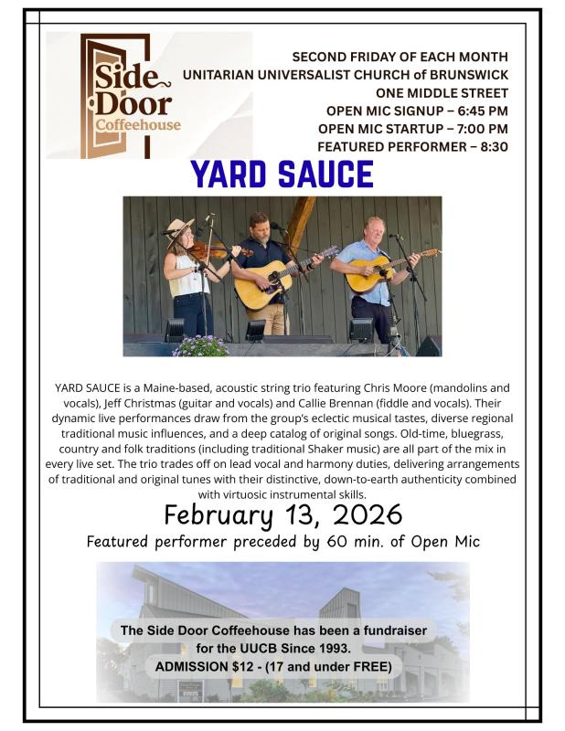The Side Door Coffeehouse is a venue for local musicians and others (professional and amateur) to share their talents, and for residents and visitors of the Midcoast community to enjoy great entertainment and conversation in a relaxed setting. Organized by a group of volunteers from the Unitarian Universalist Church of Brunswick, the Side Door Coffeehouse operates on the second Friday of every month except August.