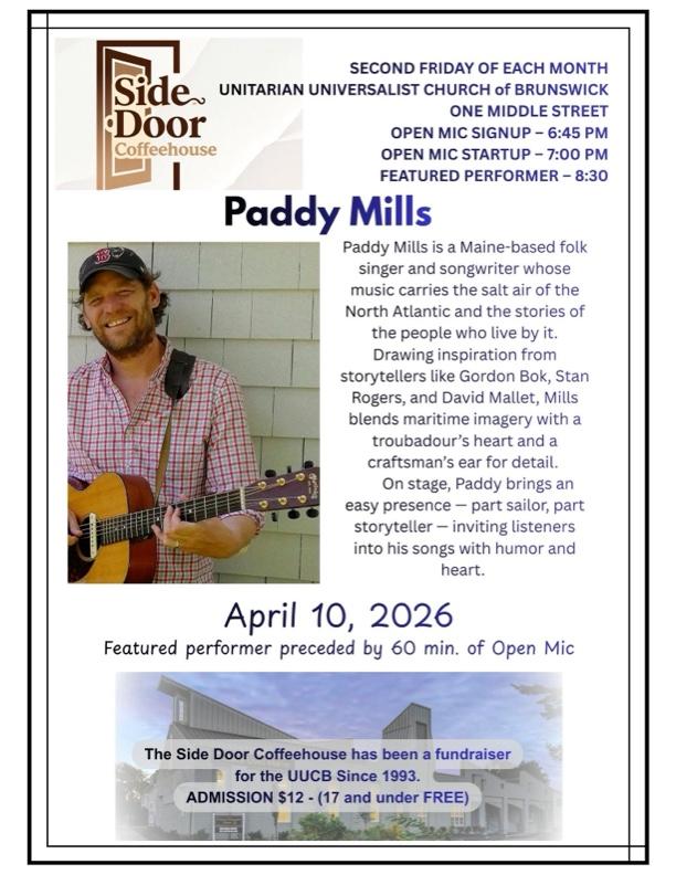 The Side Door Coffeehouse is a venue for local musicians and others (professional and amateur) to share their talents, and for residents and visitors of the Midcoast community to enjoy great entertainment and conversation in a relaxed setting. Organized by a group of volunteers from the Unitarian Universalist Church of Brunswick, the Side Door Coffeehouse operates on the second Friday of every month except August.