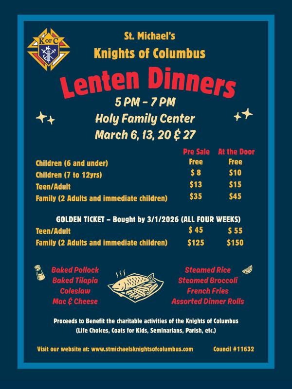 Come join the St. Michael's Knights of Columbus for great food, music and comradery at our Lenten Dinners on Fridays from March 6 through March 27 from 5PM to 7PM. All major credit cards accepted as well as cash and checks. Buy your tickets before Fridays to get great discounts on tickets, or get a Golden Ticket (individual or family) now for all 4 Friday Dinners!