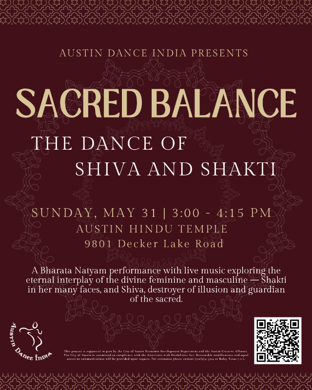 Sacred Balance: The Dance of Shiva and Shakti is a Bharata Natyam performance with live music exploring the eternal interplay between the divine feminine and masculine. Shakti, the Goddess in her many faces — fierce and tender, radiant and wild — and Shiva, destroyer of illusion and guardian of the sacred, come alive through original choreography rooted in classical lineage.