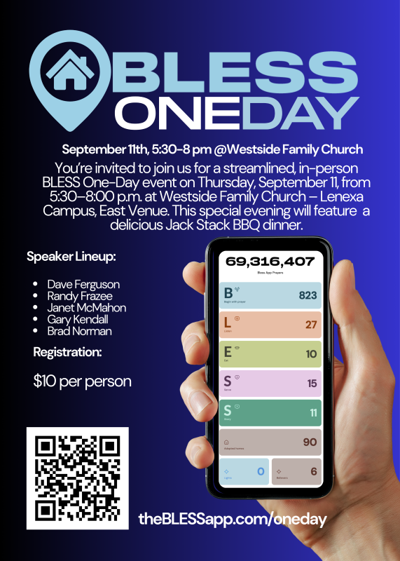 You’re invited to join us for a streamlined, in-person BLESS One-Day event on Thursday, September 11, from 5:30–8:00 p.m. at Westside Family Church – Lenexa Campus, East Venue. This special evening will feature Dave Ferguson, Randy Frazee, Janet McMahon, Gary Kendall, Brad Norman, and a delicious Jack Stack BBQ dinner.