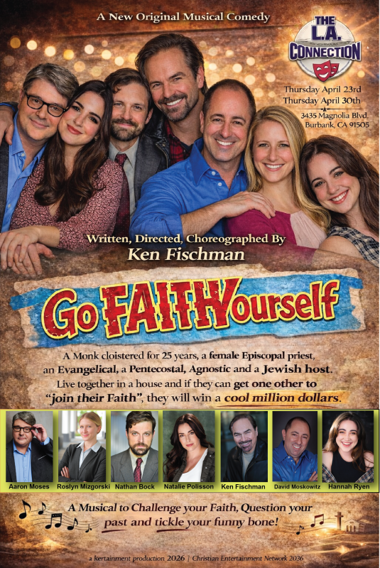 "Go Faith Yourself", What could go wrong when you put four Christians of different denominations, an Agnostic and a Jew together for 6 weeks to win a million dollars? Everything! The winner must convince the others to join their "FAITH". Hellarity ensues. Witness how diversity becomes commonality...or does it? It's certain to challenge your ideas of doctrine, dogma and denomination through fun, comedy, high jinks and love. This NEW MUSICAL