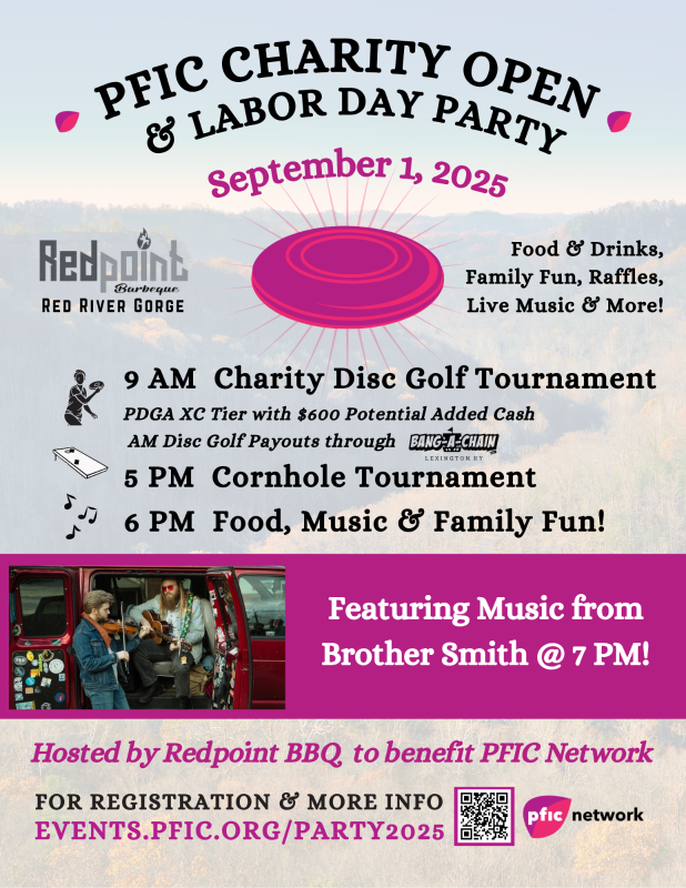 Proceeds from this event will benefit PFIC Network! Progressive Familial Intrahepatic Cholestasis (PFIC) is a rare genetic liver disease that typically leads to liver failure before age 10. PFIC Network is based in the Red River Gorge and supports the global PFIC patient community.