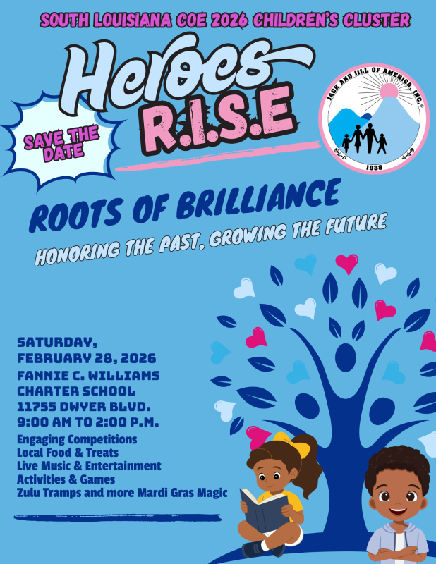 Children’s Cluster provides a space for our youngest children to develop through structured, age-appropriate activities that foster community, unity and a sense of belonging among children and their families. The Two Time Five Star Notable New Orleans Chapter is excited to welcome you to the 2026 South Louisiana COE Children’s Cluster. We invite you to take part in a powerful all-day program celebrating the rich legacy and lasting impact of African Americans throughout history. Through music, art, storytelling, STEM activities, and hands-on workshops, our Jacks and Jills will learn about the achievements of African American pioneers and the principles they stood for—courage, innovation, resilience, and community. As we honor those who came before us, we plant seeds in our children encouraging them to dream big, think boldly, and understand that they, too, can become history makers. Greatness is not only inherited, it's cultivated. It all begins at the venue hosting us, Fannie C. Williams School is named after an African American who was a pioneer in the education of African American children in the South while also remaining committed to community development.