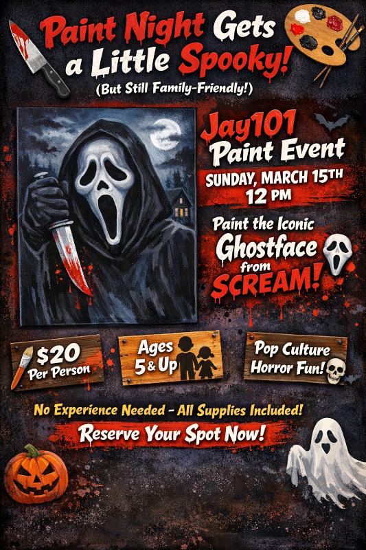 Get ready to scream… with excitement! Join us for our next Jay101 Paint Event on Sunday, March 15th at 12 PM, where we’ll be painting an iconic ghost-masked slasher legend inspired by the Scream franchise. 👻🖤