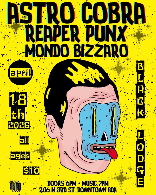 Black Lodge brings you an evening of high enegry punk rock featuring Mondo Bizarro, a four piece underground rock group with a punk rock flair, joined by melodious mischeif makers Reaper Punx joining us from Seattle, and local punk rawkers Astro Cobra with thier high energy, sound.