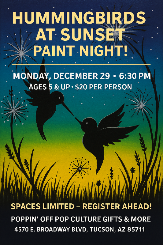 #PaintNight #HummingbirdArt #SunsetVibes #PopCultureArt #TucsonEvents #FamilyFun #PoppinOff #CreativeCommunity #SupportLocal #ArtNight