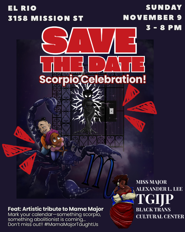 Join us at EL RIO for a night of uplifting Scorpios! Our Founders Alex L Lee and Miss Major (Rest In Power) are scorpios. Our former executive director, and now CEO, Janetta Johnson is a scorpio. Our current Executive Director is a scorpio. And former staff and current staff are also scorpios. We believe in the magic of scorpios particularly with an abolitionist politic. As per usual, we are partying against the prison industrial complex through raising money for Miss Major and Alexander L Lee’s child: TGIJP Black Trans Cultural Center, an organization dedicated to ending human rights abuses against Transgender, Gender Variant, and Intersex people, particularly Black trans women that are in locked facilities (Detention Centers, Jails, Prisons, Psych Wards, Foster-Care. etc) in California, Florida, Nationally, and Internationally!