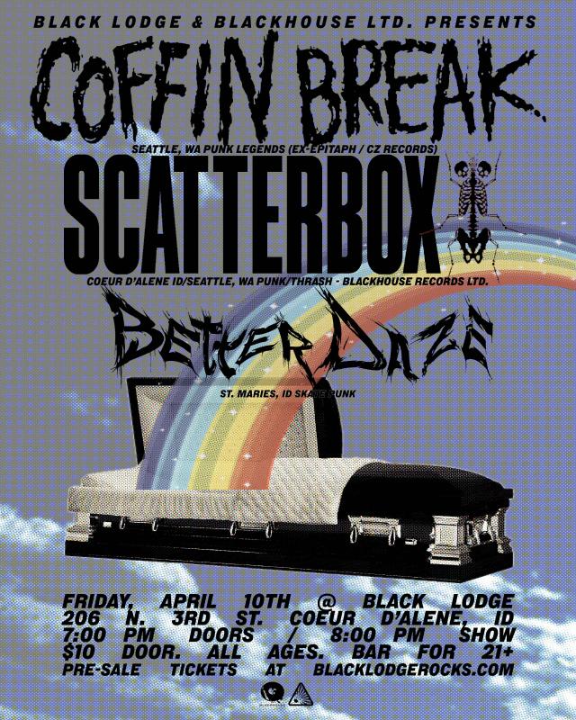 Local chaos dealers Scatterbox are stepping in with their Coeur d’Alene and Seattle bred punk thrash. Fast, loud, zero apologies. If you like riffs that feel like a runaway train and a pit that moves as one organism, you already know.