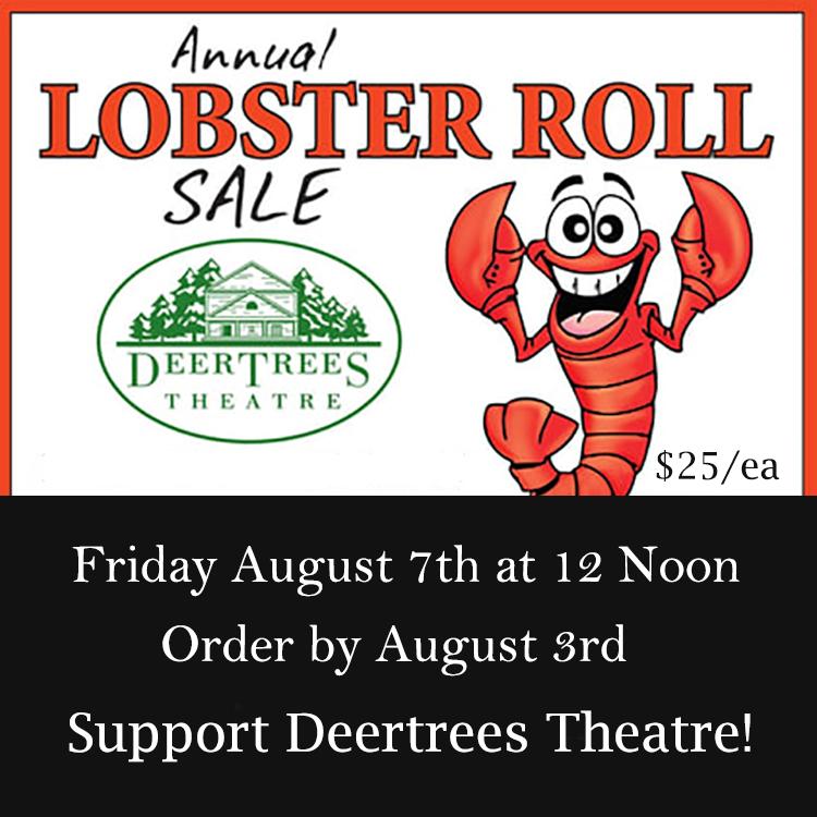 Deertrees Theatre's Summer Lobster Roll Fundraiser is Friday, August 7th. For a $25 donation per roll you will enjoy a Lobster Roll (tail, knuckle and claw), Bag of Chips and a Cookie. Proceeds will be used to support “Maine’s Most Enchanting Playhouse” Deertrees Theatre in Harrison.