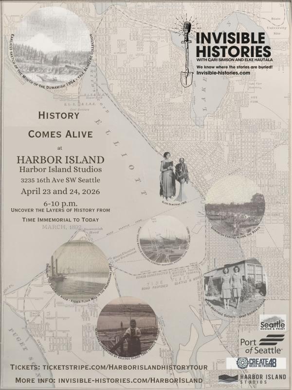 Harbor Island is like a peek behind the curtain at Seattle's secret history. 🚢 Join Invisible Histories for a spectacular two-night event bringing the hidden past of this iconic location to life! We’re activating the Harbor Island Studios—inside and out—with incredible art, sound design, live performances, and projections, all created by a diverse team of local artists. Come celebrate the island's journey, from time immemorial to the talent working there today.