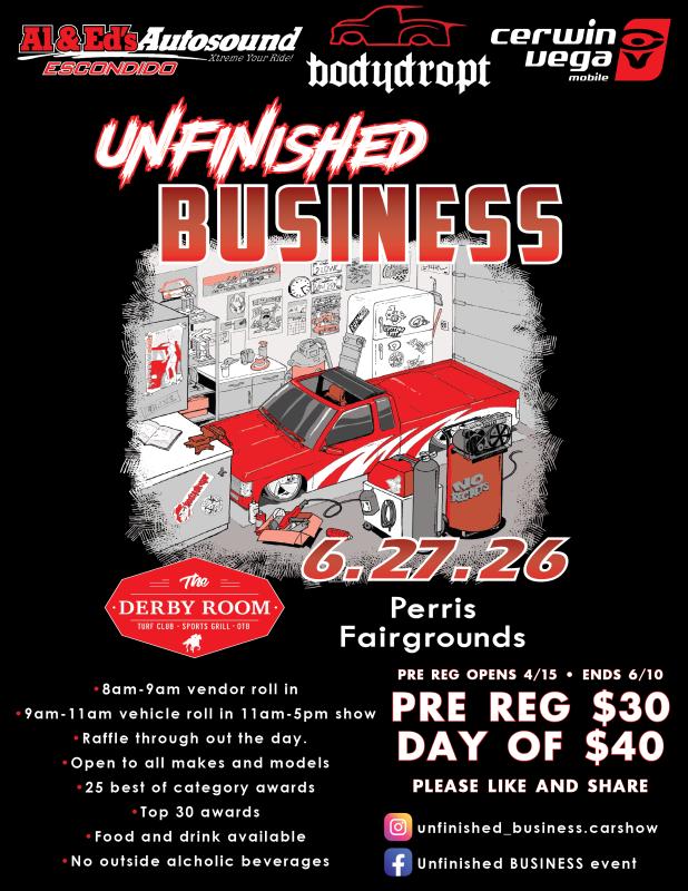 Car show is open to all makes and models, with 25 best of awards and a top 30. There is a huge raffle as well as food and drinks available on site. *No outside alcohol allowed (vehicles will be searched) Additional event info can be found on FB @ Unifinished BUSINESS event.