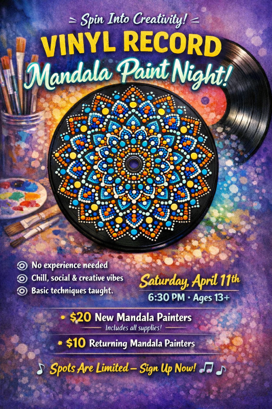 Get ready for another round of creative fun! Transform vintage vinyl records into stunning mandala masterpieces in this relaxing, beginner-friendly art night.