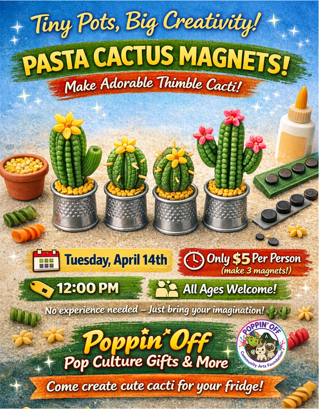 Join us at Poppin’ Off Pop Culture Gifts & More for our next Midday Crafts where we’re creating the cutest little pasta cactus magnets—planted in tiny thimble pots!