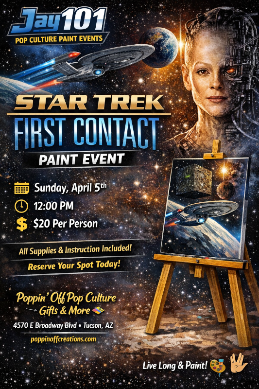 Attention Starfleet cadets, Klingon warriors, and curious explorers of the final frontier! It’s time to boldly go where your paintbrush has never gone before. Join us at Poppin’ Off Pop Culture Gifts & More for our next Jay101 Pop Culture Paint Event, inspired by Star Trek: First Contact.