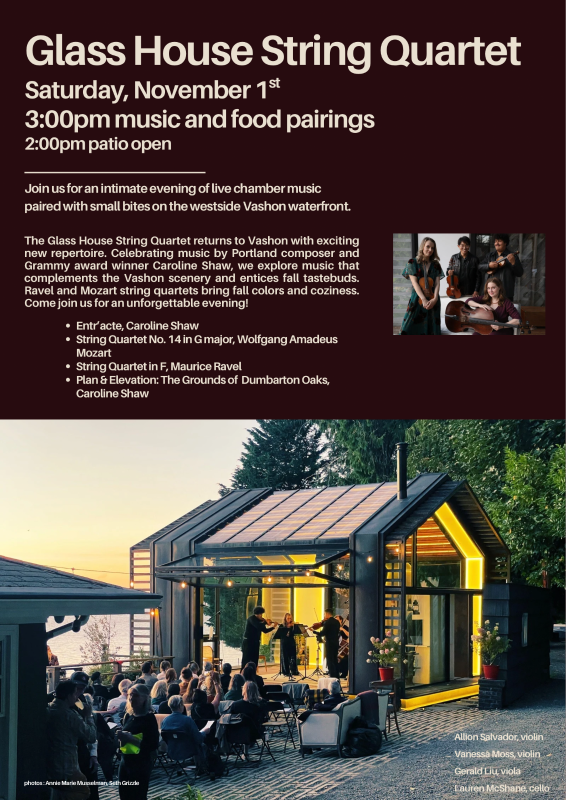 Glass House String Quartet returns to Vashon with exciting new repertoire of classical and contemporary chamber music. Celebrating the work of Portland composer and Grammy winner Caroline Shaw, we explore music that expands our palletes and entices our palates. Ravel and Mozart join the conversation with string quartets evoking fall color and coziness. Listen for responses from Shaw. We will be transported together in this "secret concert" set in a stunning glass house on the Vashon waterfront as the sun descends toward the Olympic Mountains. The sensory tableau is completed with delicious food and drink inspired by the occasion. We will serve small plates of seasonal fare throughout the program.