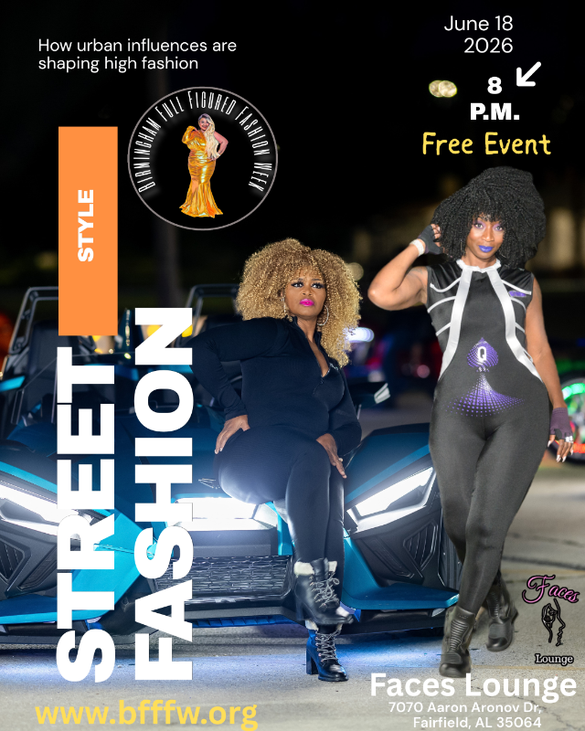 It's back! Birmingham Full Figured Fashion Week's, "Street Fashions" is back to bring you the lastest trends in street fashion from causal wear to club wear. Come and experience this unique blend where fashion meets the pavement.