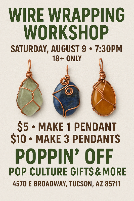 Join us for a Wire Wrapping Workshop on Saturday, August 9th at 7:30pm at Poppin' Off Pop Culture Gifts & More!