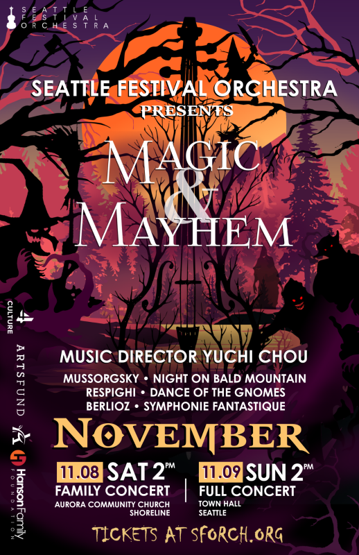 Every great story begins with a little mystery and a touch of mischief. Seattle Festival Orchestra opens the season with three vivid musical tales: Mussorgsky’s Night on Bald Mountain, where ghostly figures swirl through a stormy night; Respighi’s Dance of the Gnomes, a mischievous romp led by gnomes and woodland spirits; and Berlioz’s Symphonie Fantastique, a sweeping saga of love, longing, and one wildly imaginative dream. Together, these dramatic works invite listeners on a journey where music becomes the storyteller.