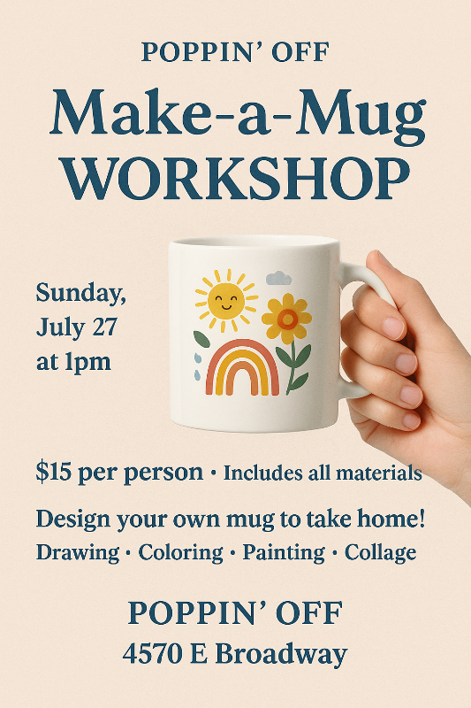#MakeAMug #CreativeWorkshop #TucsonEvents #PoppinOffTucson #DIYMugDesign #WeekendInTucson #MugArt #PaintAndCreate #TucsonSmallBiz #CraftYourStyle #PopCultureCrafts