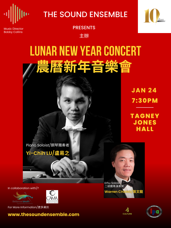 Join us for The Sound Ensemble's first annual Lunar New Year Concert. This event will be a multi-cultural opportunity to celebrate the incredible musical skill, artistry and heritage of our rich Asian American community. In order to serve our diverse community, each year we will perform music from leading composers of the countries that celebrate. This year we are featuring the incredible skills of piano soloist Yi-Chih LU, Erhu soloist Warren CHANG, members of the Seattle Chinese Orchestra and students from the Bellevue Youth Symphony.