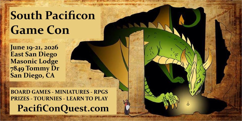 Good for one human to enter South Pacificon Game Fest 2026 Friday June 19, 2026 at the East San Diego Masonic Lodge, located at 7849 Tommy Dr San Diego, CA 92119. Passholder may signup to participate in any event that does not have an additional fee, unless that additional fee is paid.