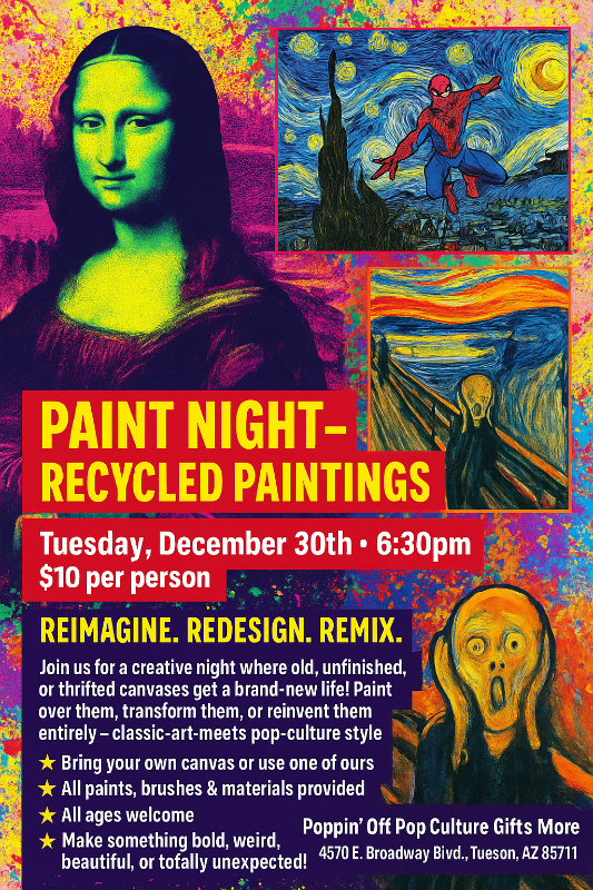 Ready to give old art NEW life? Join us at Poppin’ Off Pop Culture Gifts & More for a creative twist on paint night! We’re taking old, unfinished, or abandoned canvases and transforming them into brand-new masterpieces—your way, your style, your imagination!