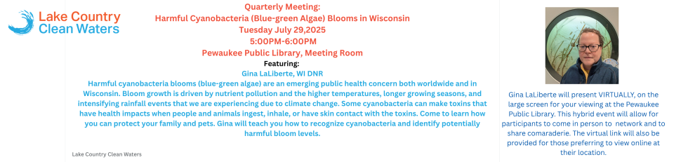 Gina LaLiberte leads response and communication on cyanobacterial bloom issues as the Statewide Harmful Algal Bloom Coordinator for the WI DNR. Harmful cyanobacteria blooms (blue-green algae) are an emerging public health concern both worldwide and in Wisconsin. Bloom growth is driven by nutrient pollution and the higher temperatures, longer growing seasons, and intensifying rainfall events that we are experiencing due to climate change. Some cyanobacteria can make toxins that have health impacts when people and animals ingest, inhale, or have skin contact with the toxins. Come to learn how you can protect your family and pets. Gina will teach you how to recognize cyanobacteria and identify potentially harmful bloom levels. Gina will be virtual, presented on the large screen at the Pewaukee Library Meeting Room. This hybrid event in person at the Pewaukee Public Library will allow for participants to network and share comaraderie. For those who prefer to view virtually, please register, then email us at info@lakecountrycleanwaters.org and we will provide the virtual link to you.