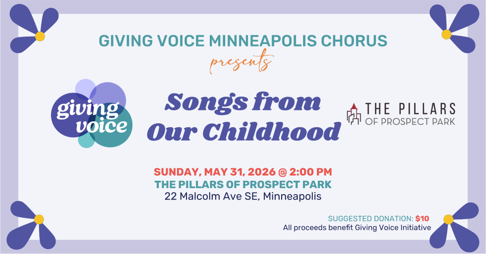 Each semester of our Giving Voice Twin Cities Chorus program culminates in a joyful, uplifting, family-friendly community concert of great music and moving singer stories. For Spring 2026, each Giving Voice Twin Cities Chorus is working on Songs from Our Childhood. We hope you will join us to celebrate the dedication we give to this music and to each other at our 13 weekly rehearsals throughout the semester.
