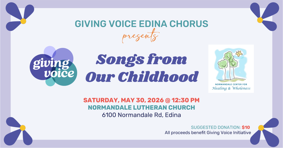 The Giving Voice Edina Chorus that rehearses at Normandale Lutheran Church on Tuesdays at 10 AM through a partnership with Normandale Center for Healing & Wholeness will have its concert at the church on Saturday, May 30 at 12:30 PM. Please join us after the concert to connect with our singers and enjoy refreshments.