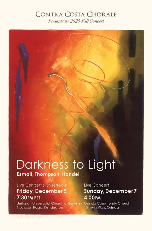 The Contra Costa Chorale presents their fall program, "Darkness to Light" on Friday, December 5th at 7:30pm at the Unitarian Universalist Church of Berkeley, and on Sunday, December 7 at 4:00pm at the Orinda Community Church.