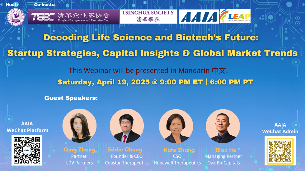 NAFTHAA, TEEC, Tsinghua Society, AAIA, and LEAP Career are hosting a Webinar entitled "Decoding Life Science and Biotech's Future: Startup Strategies, Capital Insights & Global Market Trends". This event will be presented in Chinese Mandarin. This event will cover the following topics: