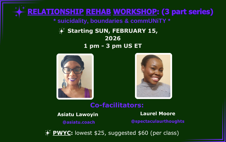Asiatu (they/them) is a neurovaried, multiply marginalized, sociologist & commUNiTY coach. They use both their education (B.A. from Spelman College) as well as their lived experiences to help others prioritize harm reduction of both themselves & others by divesting from white “supremacist” patriarchal norms. They teach people how to have healthy relationships. Their foundational understanding of collective liberation is “CommUNiTY means shrinking your i.”