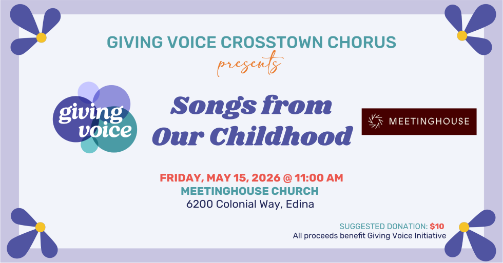Each semester of our Giving Voice Twin Cities Chorus program culminates in a joyful, uplifting, family-friendly community concert of great music and moving singer stories. For Spring 2026, each Giving Voice Twin Cities Chorus is working on Songs from Our Childhood. We hope you will join us to celebrate the dedication we give to this music and to each other at our 13 weekly rehearsals throughout the semester.