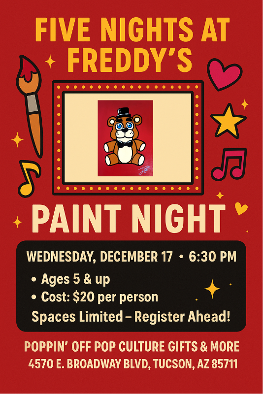 #PaintNight #FNaF #FiveNightsAtFreddys #PopCultureArt #PoppinOff #TucsonEvents #FamilyFun #CreativeCommunity #SupportLocal #HorrorArt