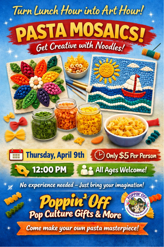 Join us at Poppin’ Off Pop Culture Gifts & More for our next Midday Crafts session where we’re turning pasta into mini masterpieces!
