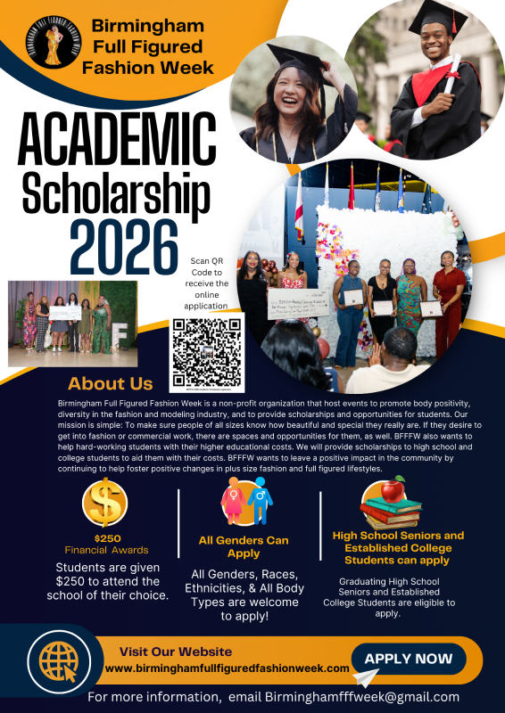 Birmingham Full Figured Fashion Week is a non-profit organization that host events to promote body positivity, diversity in the fashion and modeling industry, and to provide scholarships and opportunities for students. Our mission is simple: To make sure people of all sizes know how beautiful and special they really are. If they desire to get into fashion or commercial work, there are spaces and opportunities for them, as well. BFFFW also wants to help hard-working students with their higher educational costs. We will provide scholarships to high schoolol and college students to aid them with their costs. BFFFW wants to leave a positive impact in the community by continuing to help foster positive changes in plus size fashion and full figured lifestyles.