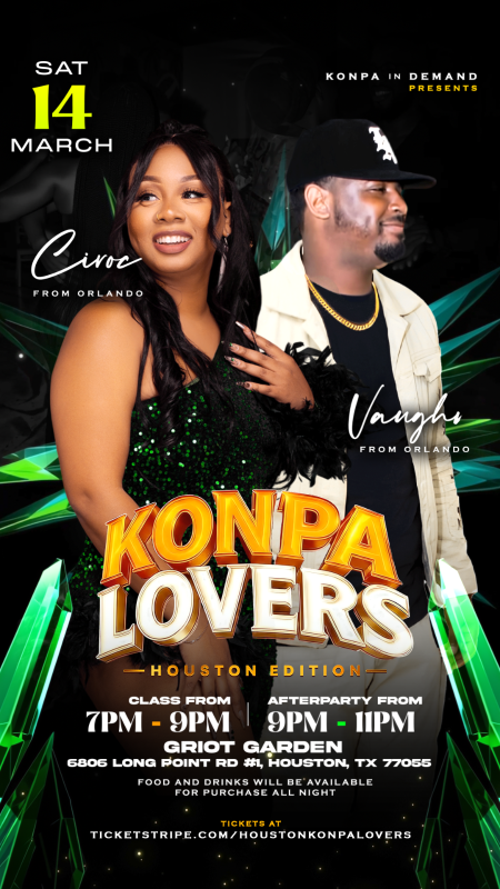 On Saturday, March 14th, Konpa In Demand instructors Ciroc and Vaughn from Orlando will be teaching a special Konpa dance class at Griot Garden in Houston from 7pm-9pm. Whether you're a beginner or looking to refine your moves, this class is the perfect opportunity to experience the rhythm and passion of Konpa.