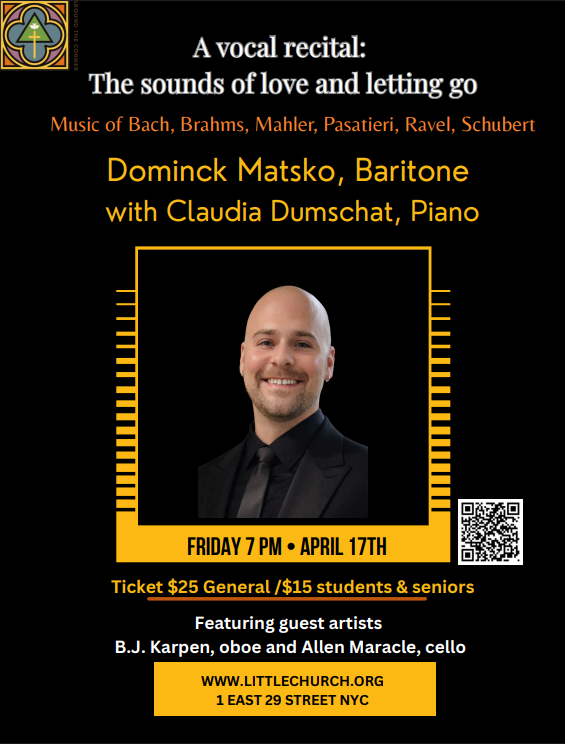 We invite you to join us for a special vocal recital featuring Dominick Matsko, baritone with Claudia Dumschat, piano and guest artists: b.j. Karpen, oboe and Allen Maracle, cello.