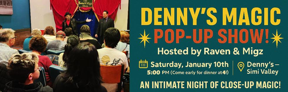 Coming early, around 4:00 PM for a pre-show meal is a huge help and makes Denny’s happy to continue hosting these magic pop-ups. Your support enables us to maintain low ticket prices while delivering top-tier magic to Simi Valley.