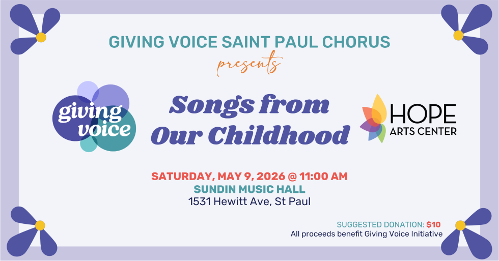 Each semester of our Giving Voice Twin Cities Chorus program culminates in a joyful, uplifting, family-friendly community concert of great music and moving singer stories. For Spring 2026, each Giving Voice Twin Cities Chorus is working on Songs from Our Childhood. We hope you will join us to celebrate the dedication we give to this music and to each other at our 13 weekly rehearsals throughout the semester.