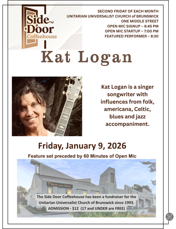 The Side Door Coffeehouse is a venue for local musicians and others (professional and amateur) to share their talents, and for residents and visitors of the Midcoast community to enjoy great entertainment and conversation in a relaxed setting. Organized by a group of volunteers from the Unitarian Universalist Church of Brunswick, the Side Door Coffeehouse operates on the second Friday of every month except August.