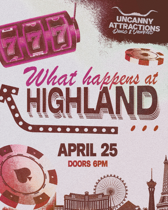 “What Happens at Highland Lounge…” is your official wrestling after-after-party: more quirky than the stadium show, more fun than the strip, and way more queer than anything you saw under those Vegas lights. Come scream, kiki, and lose your voice as we prove that in Austin, the stories don’t end at Mania...they just get campier, sparklier, and a whole lot louder at Highland. Whatever happens here? Stays in your camera roll forever.