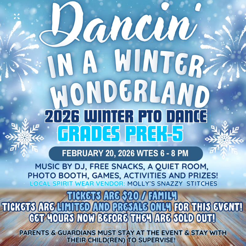 The CW Elementary PTO is sponsoring a winter wonderland themed family dance for both ITES and WTES (grades Prek-5) and we want your family to join!
