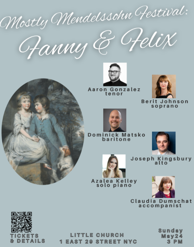 We invite you to join us for an afternoon salon of music by the Mendelssohns, featuring Berit Johnson, soprano; Joseph Kingsbury, alto; Aaron Gonzalez, tenor; Dominick Matsko, baritone; Azalea Kelley, piano, Claudia Dumschat, accompanist and organist.